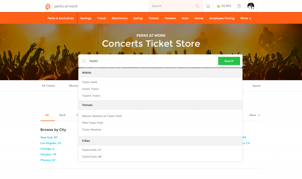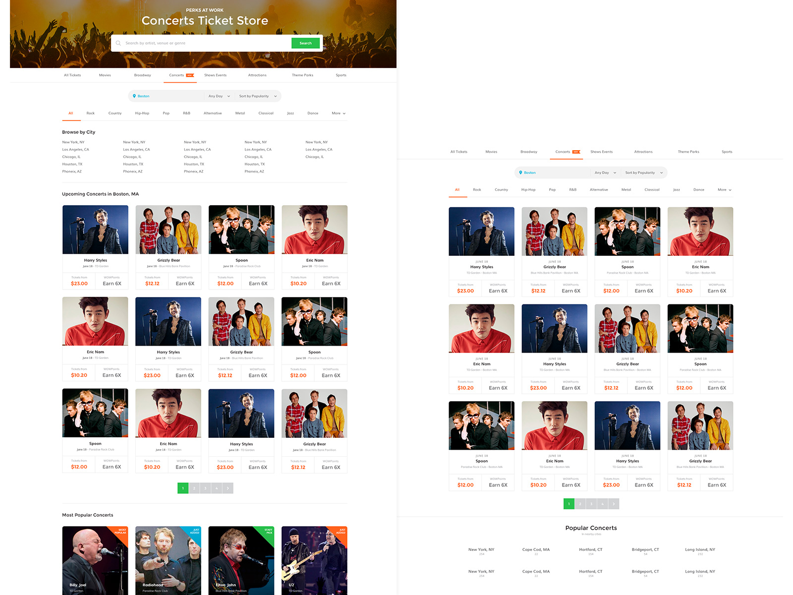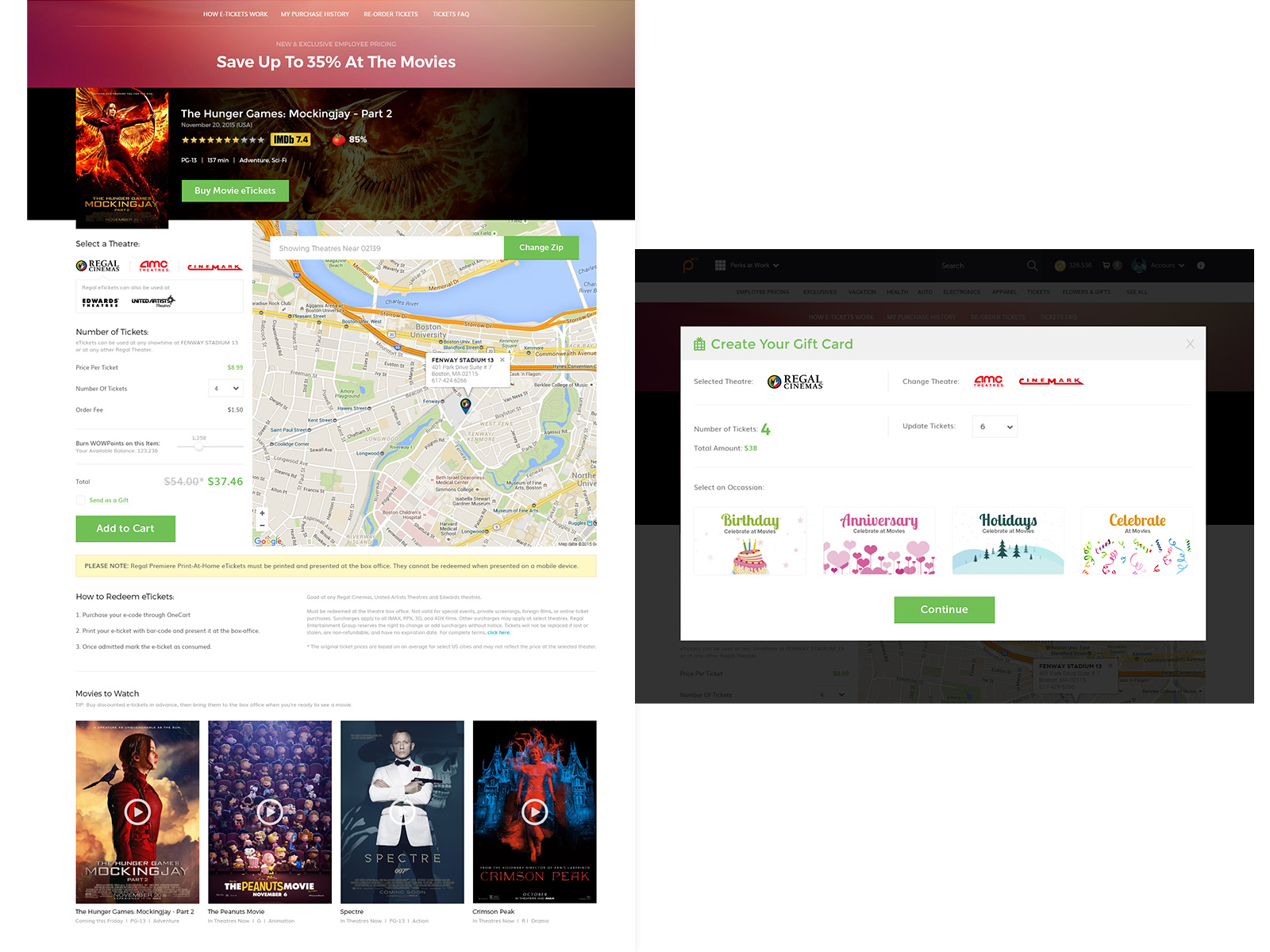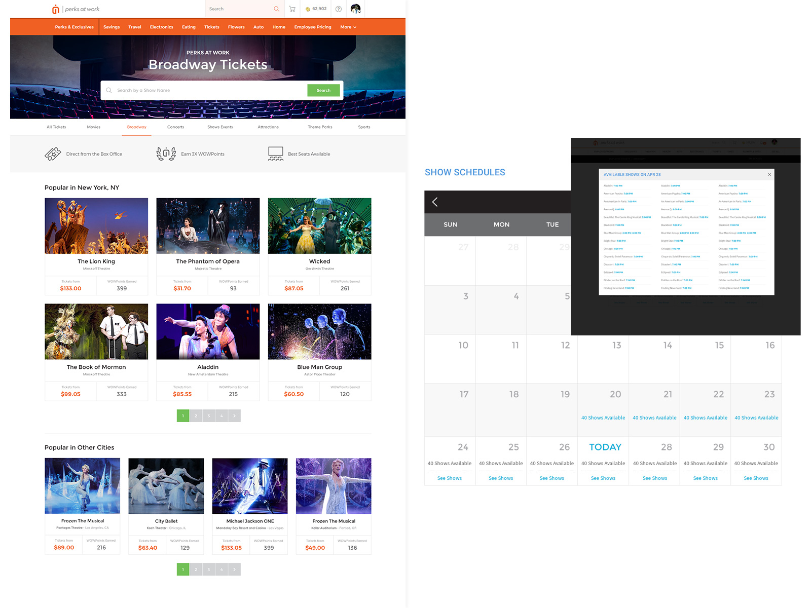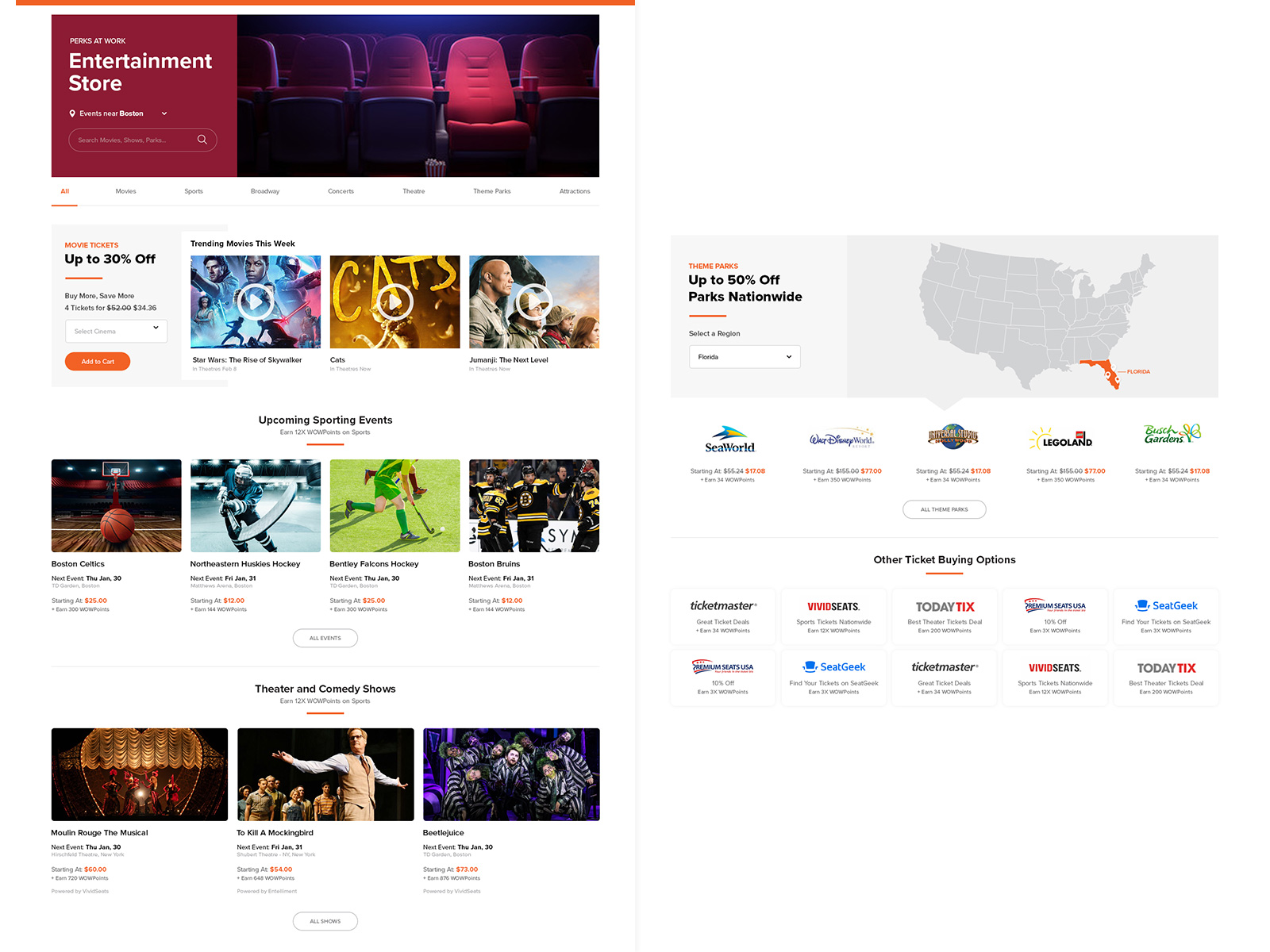 This project was of a large scale where we introduced all kinds of recreational tickets ranging from movies, theme parks, broadway, sporting events, concerts to attractions near your location, on our platform. Each category has its own flow of browsing the event and purchasing tickets for it without leaving the site.