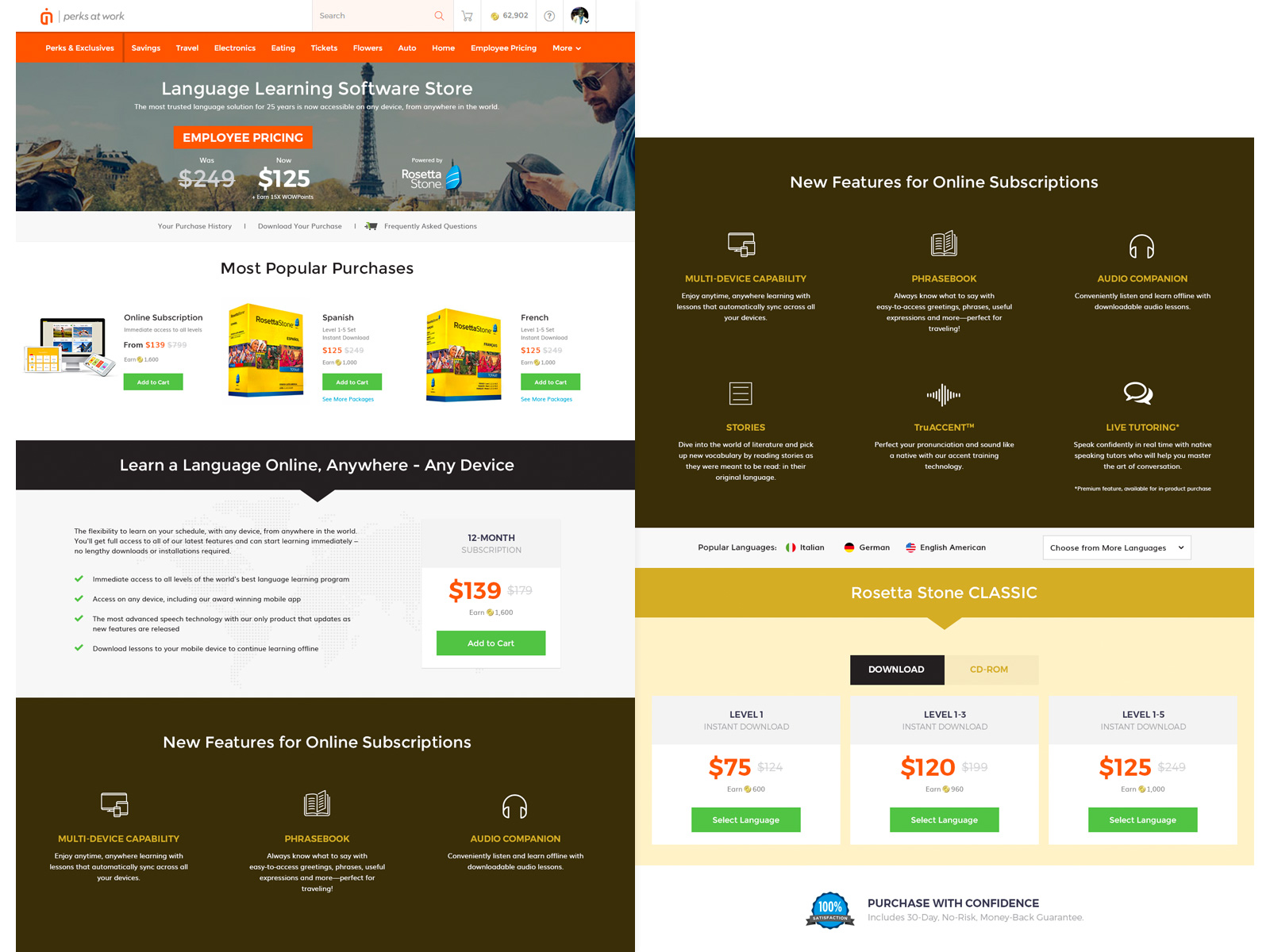 A stand-alone store dedicated to Rosetta Stone products and subscription with exclusive employee pricing. The store UI was similar to the Rosetta Stone site itself, to give users familiar experience.
