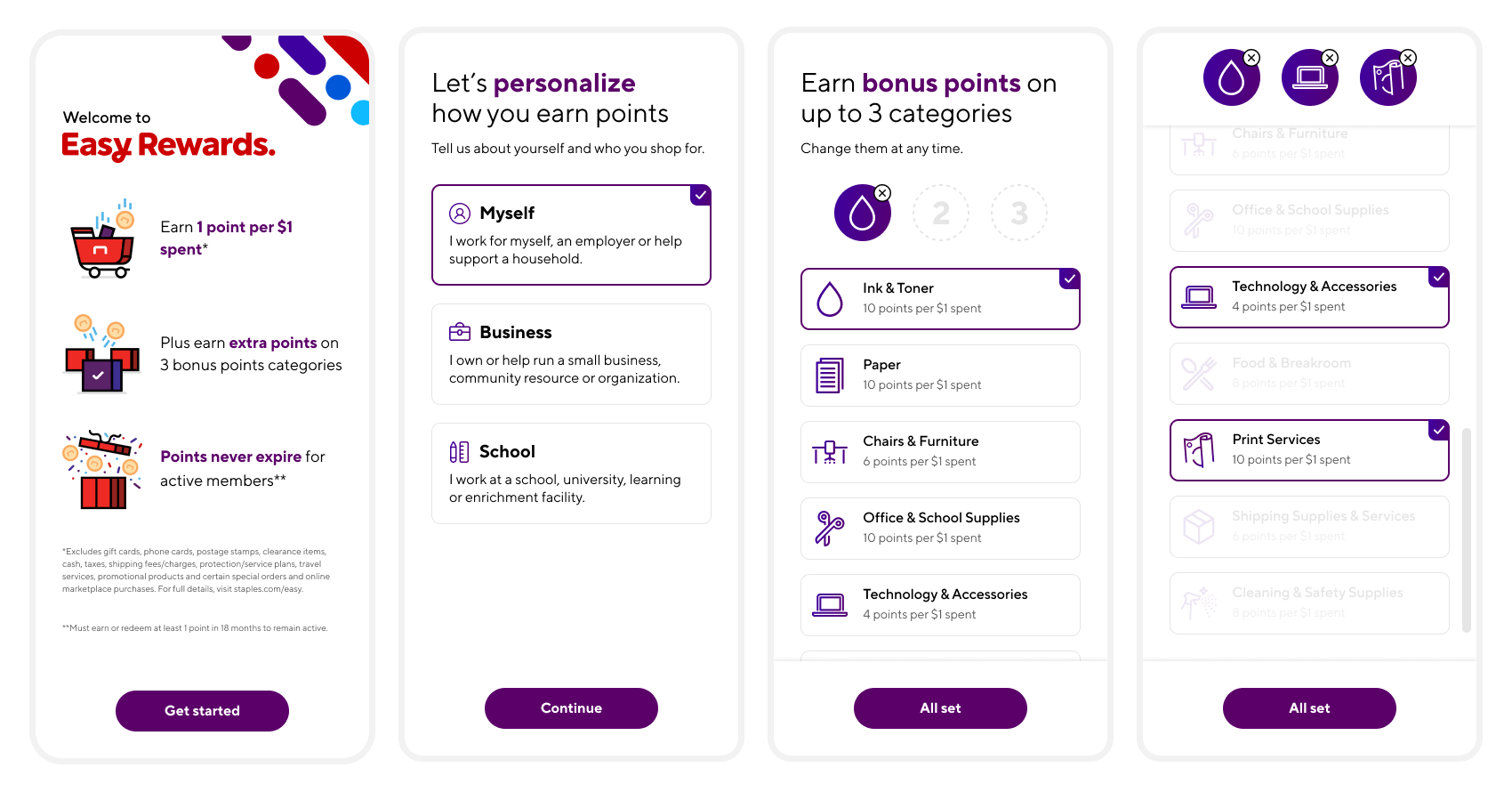 Staples reimagined its loyalty program to retain and grow its most valuable omni-shoppers (small business, teacher, consumer) while unlocking long-term, cross-channel returns for the Staples brand/enterprise. It is a free points-based program that allows customers to earn points on all their purchases, on their favorite/most shopped categories, through mass and targeted promotions, as well as non-purchase related activities such as (but not limited to) recycling, etc. Members can then use points in several ways – dollars off purchases and donations.